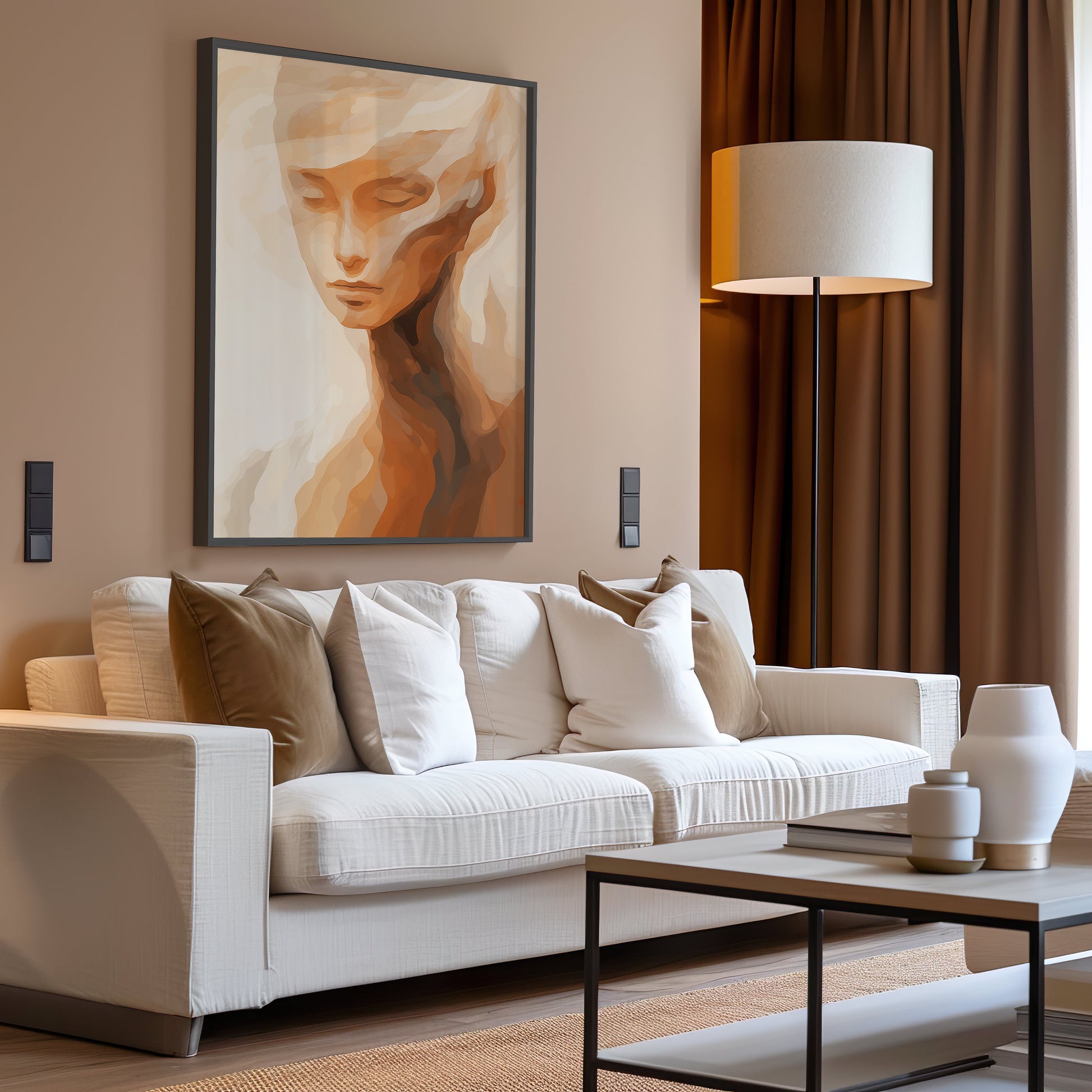 Infuse your space with tranquility and elegance with this Abstract Feminine Portrait Art Print. Featuring a serene depiction of a woman's face in soft earthy tones, this minimalist artwork is perfect for creating a calming atmosphere in any room. Its gentle color palette and abstract design make it a versatile piece that complements both modern and bohemian interiors.
