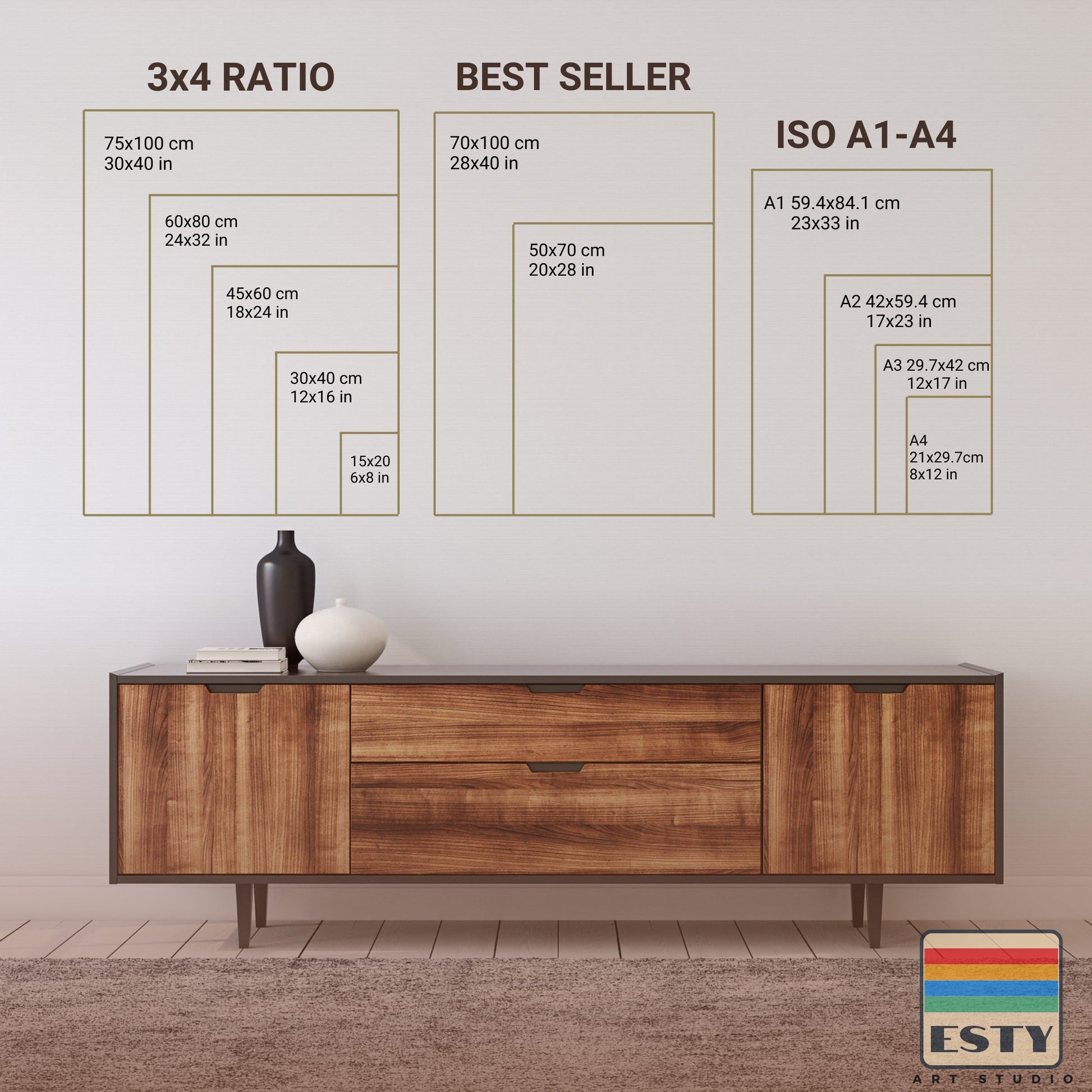 In cm: 13 x 18 cm, 15 x 20 cm, 20 x 25 cm, 21 x 29.7 cm, 27 x 35 cm, 30 x 40 cm, 30 x 45 cm, 40 x 50 cm, 42 x 59.4 cm, 45 x 60 cm, 50 x 70 cm, 60 x 80 cm, 70 x 100 cm, 75 x 100 cm
