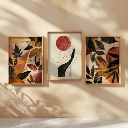 Abstract Botanical and Hand Poster Set, Boho Wall Art, Three Piece Modern Art Prints, Earthy Tones Decor, Minimalist Bohemian Poster Set
