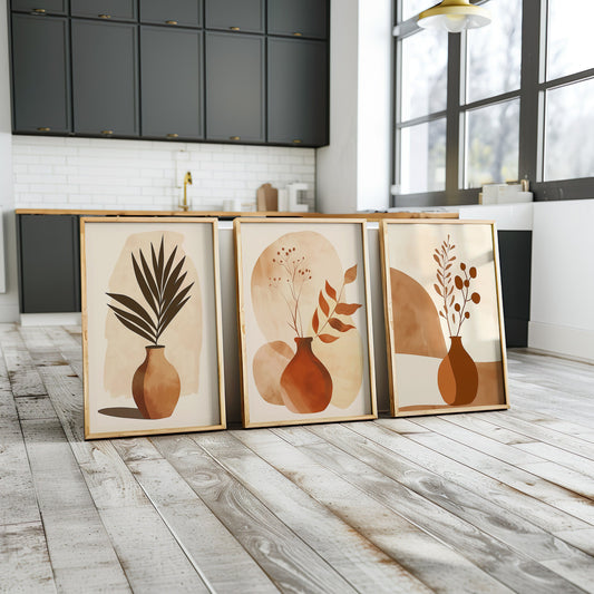 Abstract Boho Vase Trio, Earthy Tones Wall Art, Minimalist Botanical Prints Set, Modern Plant Decor, Set of Three Posters, Simple Wall Art